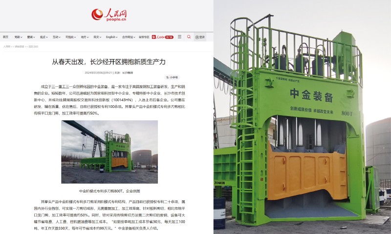 On March 6,a report titled"Starting from Spring,Changsha Economic Development Zone Embraces New Quality Productive Force”was published on people.com.cn.As a typical representative of"new quality productive force",ZONKIN step-type multi-blade shear was praised on people.com.cn,and officially recognized for its characteristics of high quality,high efficiency,and high yield.
